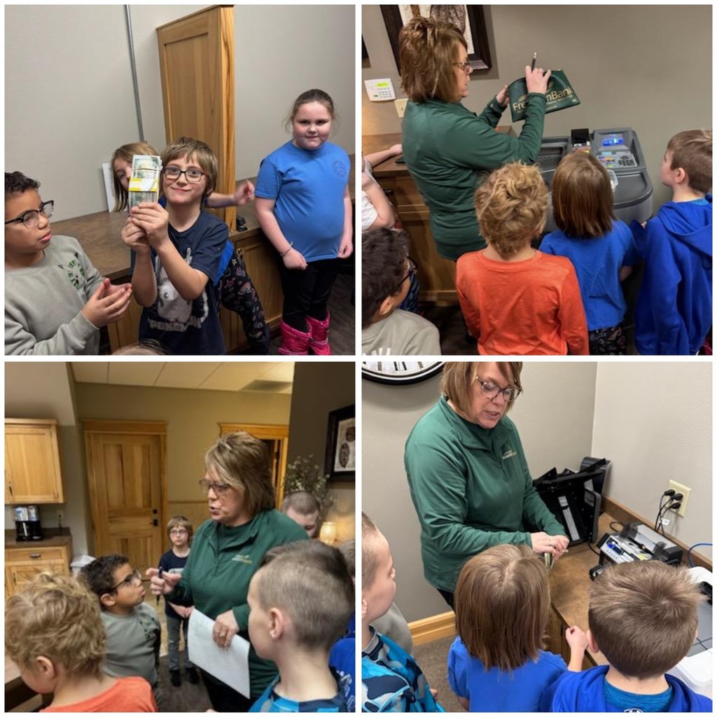 The second graders enjoyed their annual 100th day of school visit to Freedom Bank! The students enjoyed learning about money, touring the bank, the coin machine, riding the elevator, watching the security cameras, and holding $10,000 cash!! They ended the visit with cookies, milk and a great story about needs and wants!