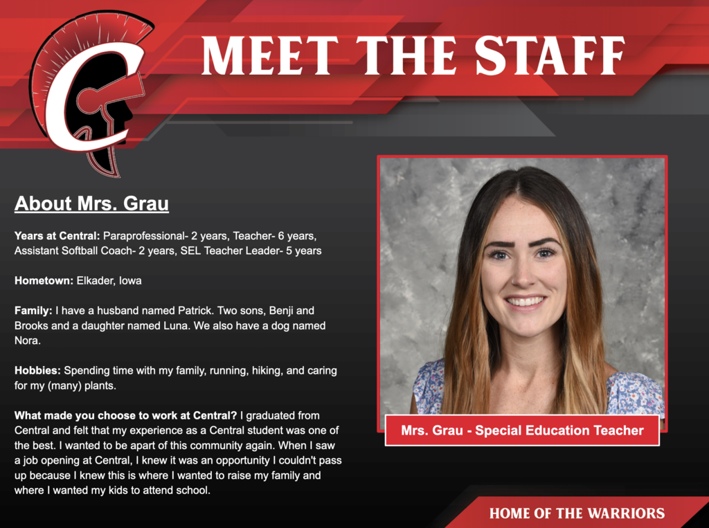 Mrs. Nicole Gray was recently hired for the 2023-2024 school year as a preschool teacher. A Central Alum, she is excited to be back where her roots are and we are excited to have her back as a Warrior! Please help us give a warm welcome to one of Central’s newest team members, Mrs. Gray!